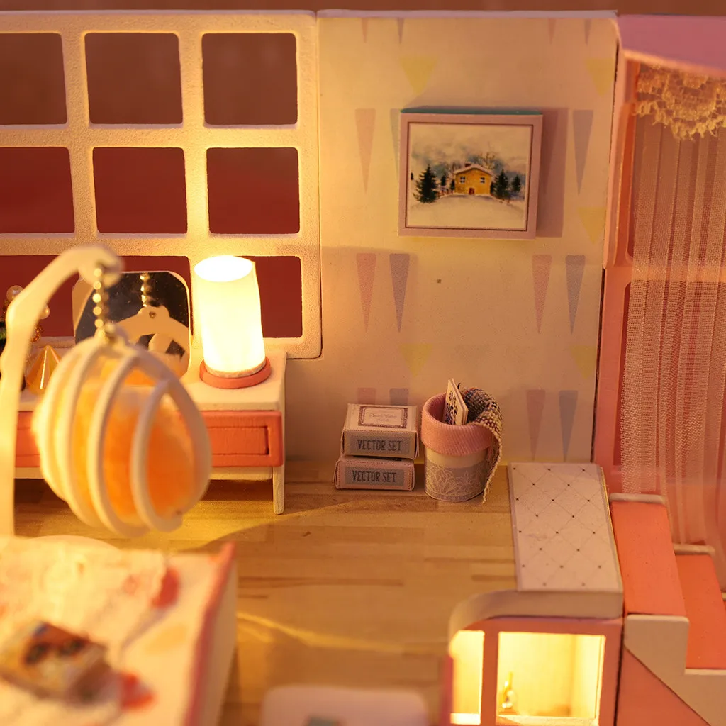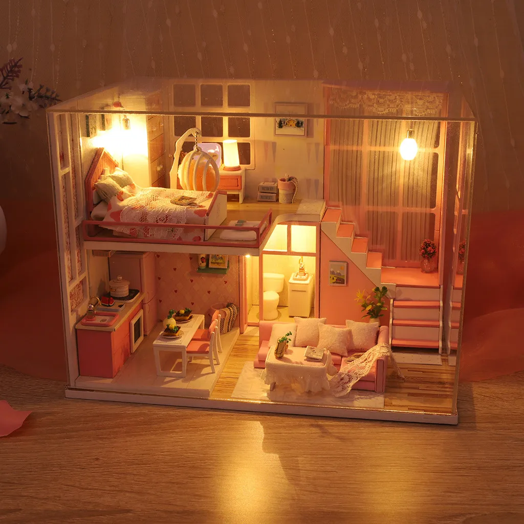 Hot Sale Kids Early Education Fun Learning Toys For Children Wooden DIY Miniature House Furniture LED House