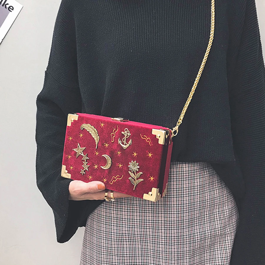 Fun Corduroy Metal Badge Box Shape Women's Handbag Black Party Clutch Bag Chain Purse Mini Shoulder